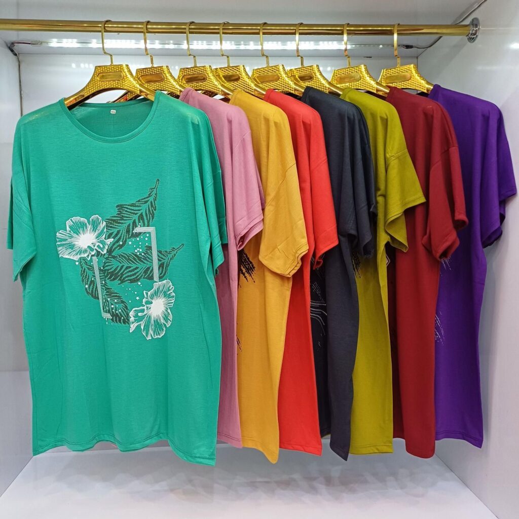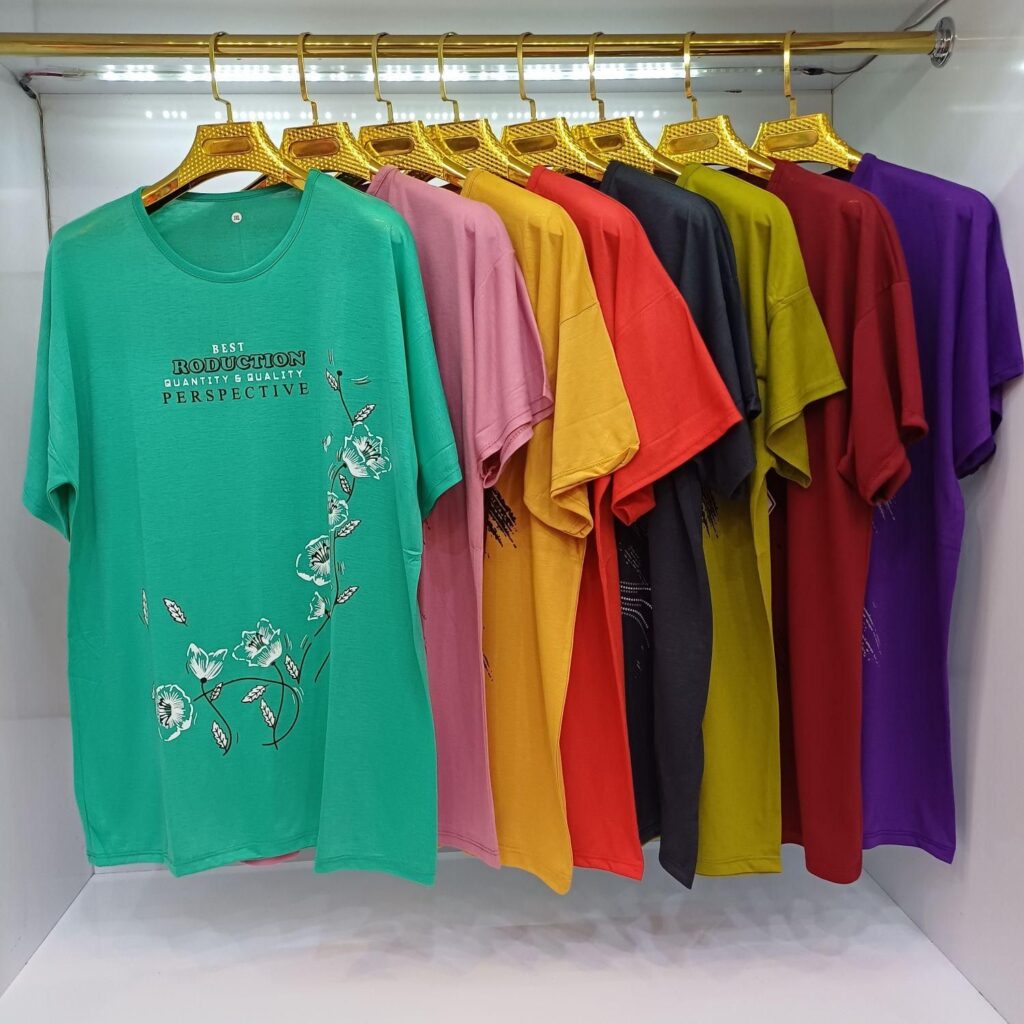 تیشرت ویسکوز رنگی زنانه سایز بزرگ از سایز ۴۶تا ۵۴ بستهبندی ۱۰ تایی ۲۰ تایی ۳۰ تایی